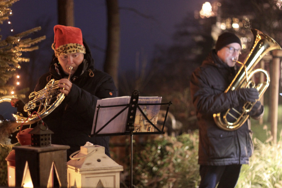 Adventskonzert im Garten unter dem Weihnachtsbaum: Das Blechbläser-Ensemble „Tuten und Blasen in Etelsen“ gab am Sonntag, den 13. Dezember 2020, für die BewohnerInnen und das Team des Senioren-Pflegezentrum BADENER BERG ein Konzert mit Weihnachtsliedern.