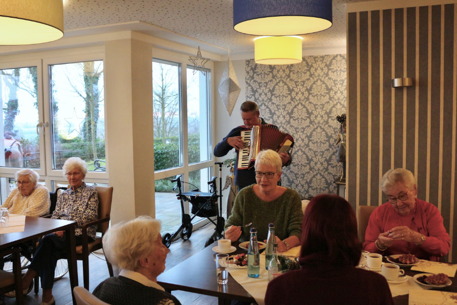 Im Eingangsbereich konnten die Gäste ihr Glück bei einer Tombola versuchen. Im Speisesaal im Erdgeschoss duftete es einladend nach Kaffee und frisch gebackenen Waffeln. Hartmut, allen im Hause bekannt durch seine regelmäßigen Plattenkisten-Nachmittage, sorgte für die musikalische Unterhaltung mit seinem Akkordeon.